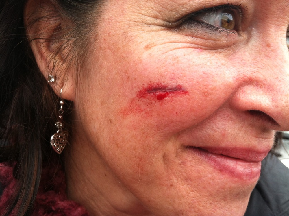 A very kind policeman approached and helped me over to sit on the bumper of a parked car. Sharlene found some napkins to mop up the blood.The police officer came back and escorted me to an ambulance. When we arrived, the paramedic told me I was fine which was odd since I didn’t feel fine and the whole side of my head was starting to swell. We asked them if they could clean out the cut on my face but they apparently don’t carry any first aid supplies with them. I asked if I should go to the hospital in case I had a concussion. He told me that he could take me there if I really, really, really wanted to go, but that was up to me. He suggested that maybe I should walk it off and then try to go home in a few hours when the crowd died down. I decided to go to the hospital instead.