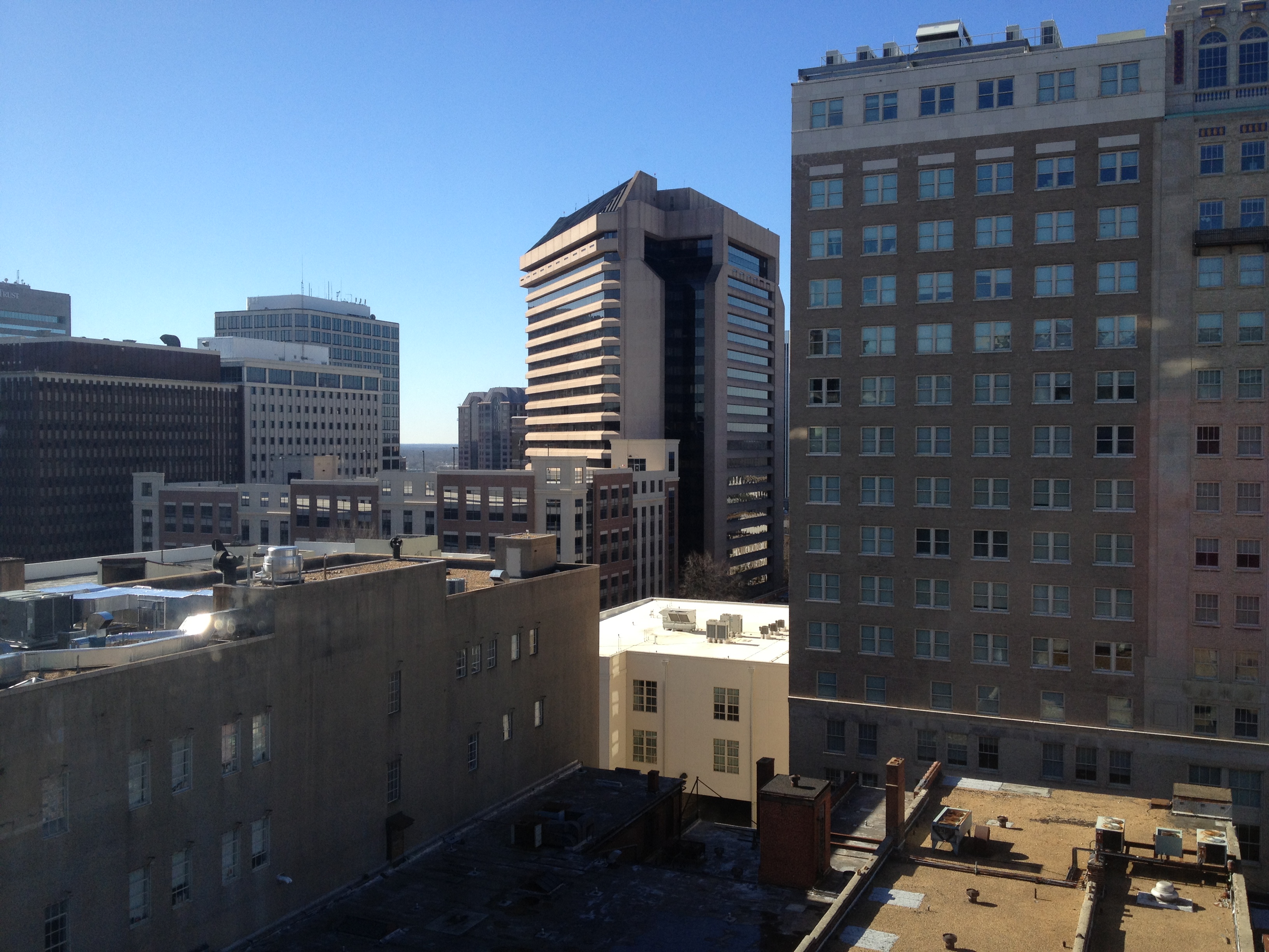 The Hilton Garden Inn, in the heart of downtown Richmond, is located in the old Miller & Rhodes building, but you can’t tell it was ever a department store. Also we were up on the top floor with an interesting urban view!