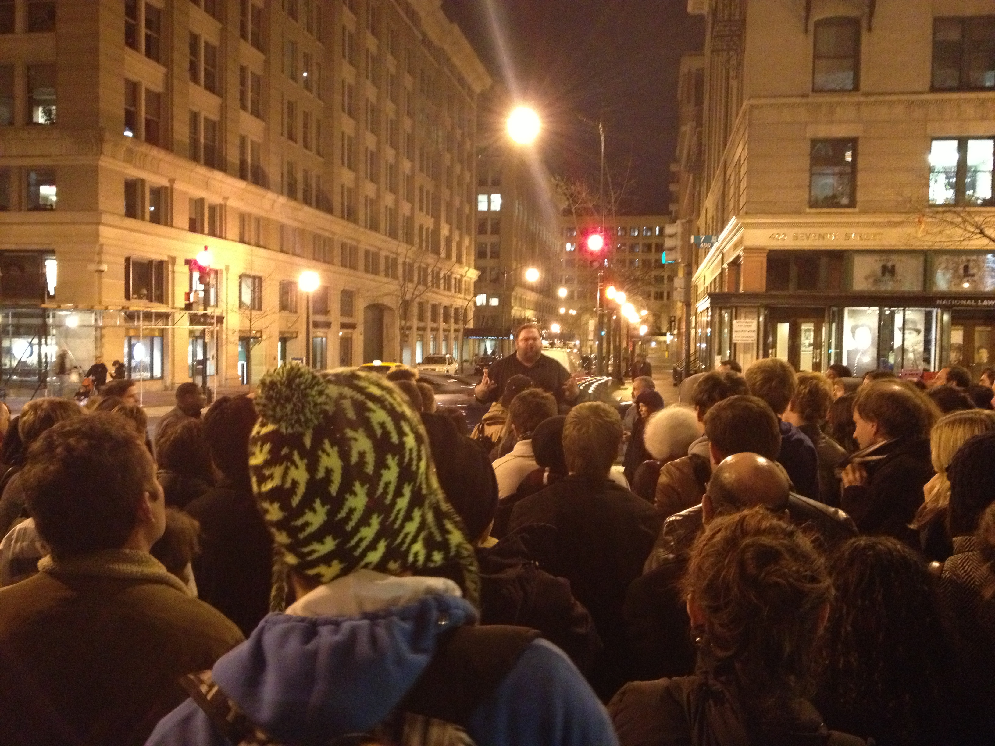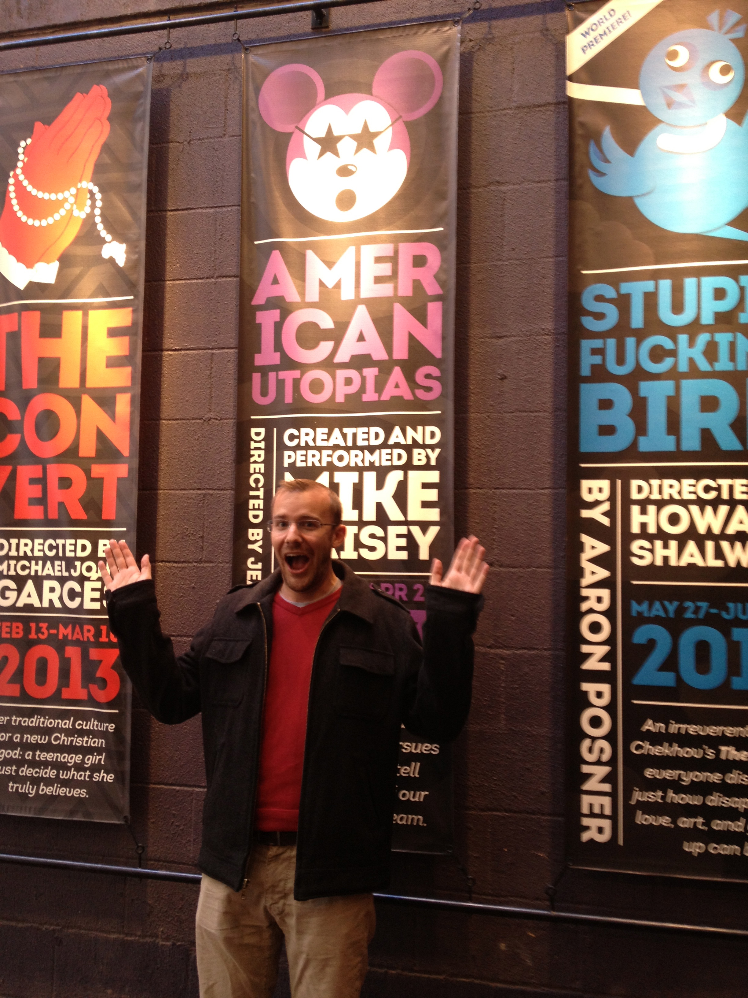 The show was fantastic. Playwright Mike Daisey sat at the table and enthralled us with a glorious tale of his travels from Burning Man to Disney World to Occupy Wall Street. His brilliant stories had us laughing out loud and really thinking about how we gather in America.