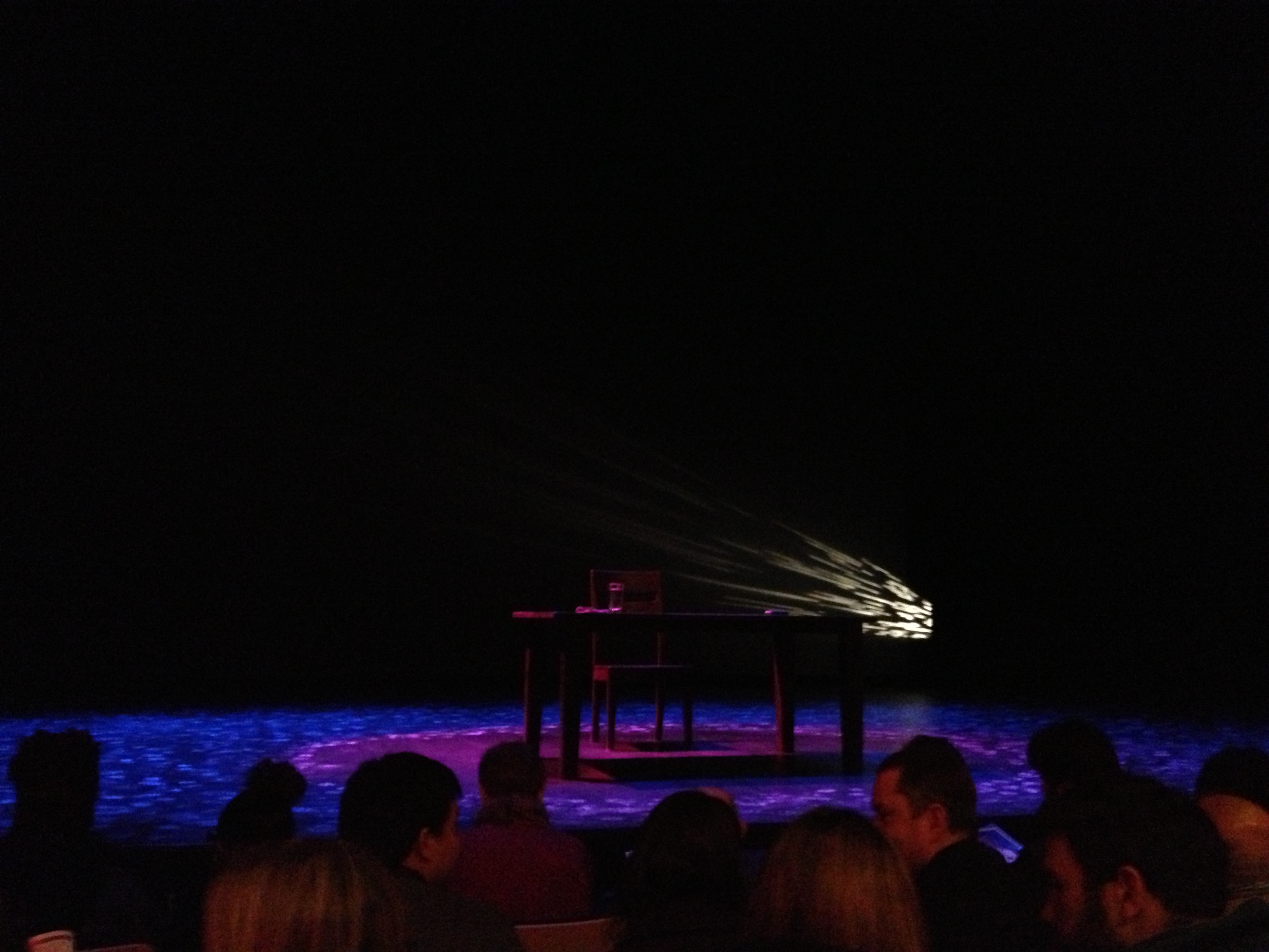 I must confess, there was a lot of buzz around the office because the promotional materials for the show mentioned gunplay, raving animatronic presidents, brutal police actions and giant glittery dildos. Most of our coworkers were interested in the giant glittery dildos. So the simple table and chair that comprised the set was a bit unsettling.