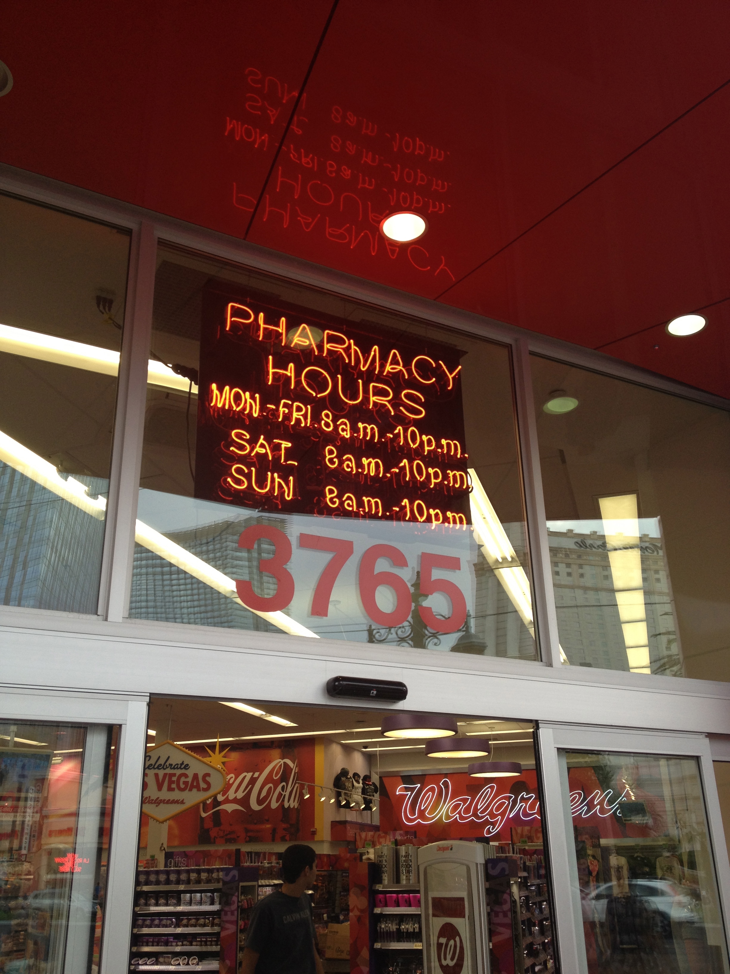 We spent another day working with local leaders and finished up early enough to embark on a quest. You see, my friend April is nervous about flying. Since I had to stay in Vegas longer, she was going to be leaving early and flying back solo. She decided that a couple of Red Box movies would distract her from hurtling through the air in a large tin tube. She did a bit of research and found a Red Box at a Walgreens on S Las Vegas Blvd.