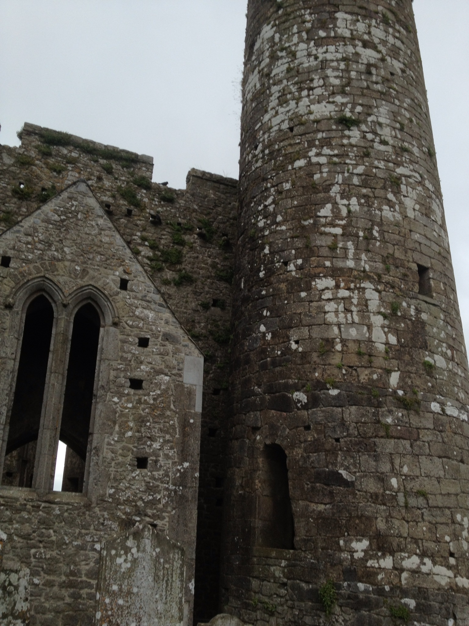 By the time I got to the Rock of Cashel the rain had let up. It’s an amazing site to see the rock and ruins rising from the city surrounding it. I parked the car and hiked up the very high hill to the gate. I arrived just as another tour was starting. The lovely young tour guide was not an actress in character, but she knew an awful lot about that rock!