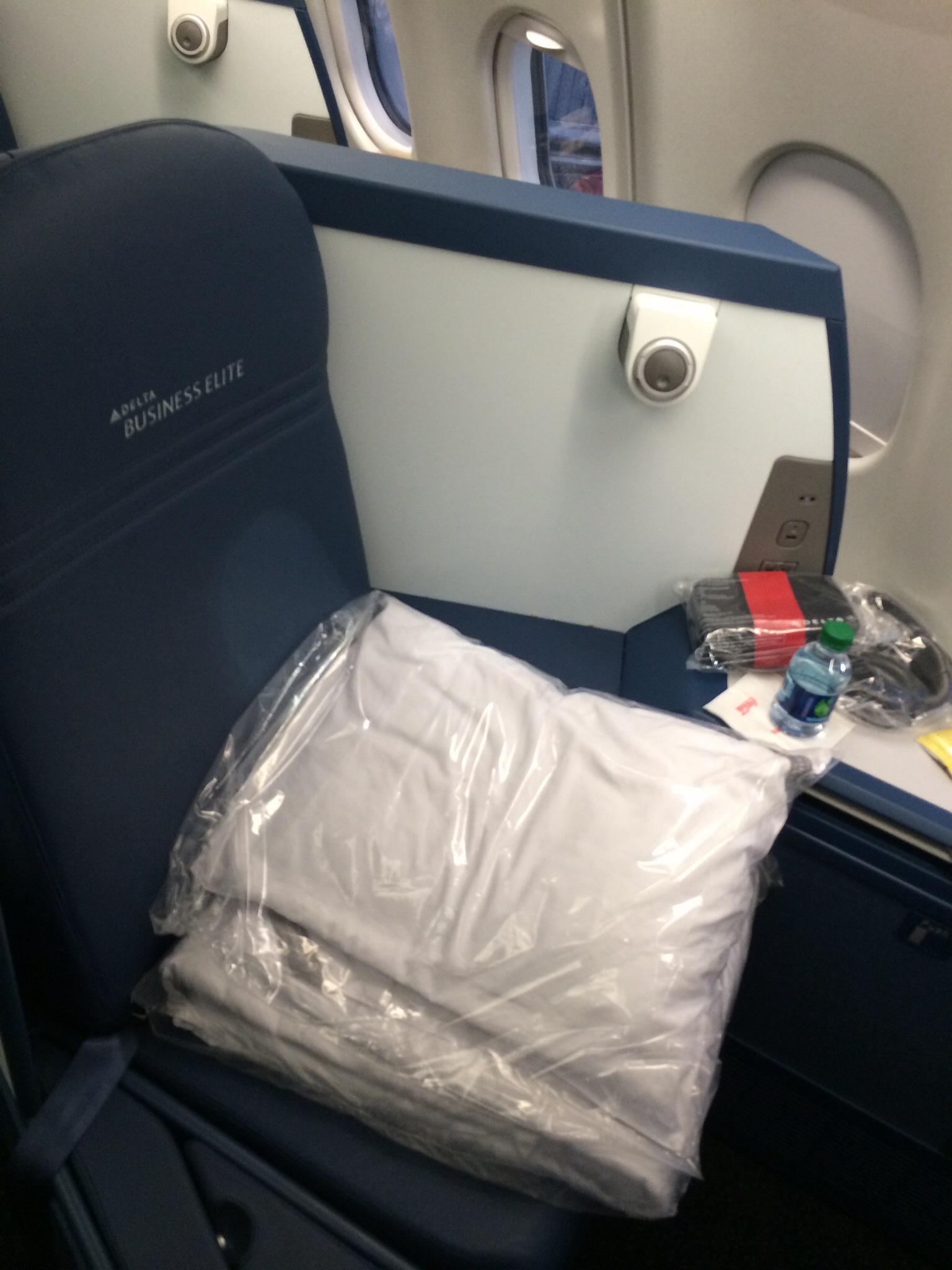 After boarding, and almost before I could move the Heavenly Blanket and down pillow on my seat aside, I was given a glass of chilled white wine and a flight attendant hefted my adorable bag into the overhead bin. I settled into my seat, put my feet up on the built-in ottoman and opened the swag bag they’d given me to explore my Delta goodies. There were a couple of flight attendants roaming the aisles with trays of wine to make sure I didn’t become parched while we waited for everyone in coach to settle down.