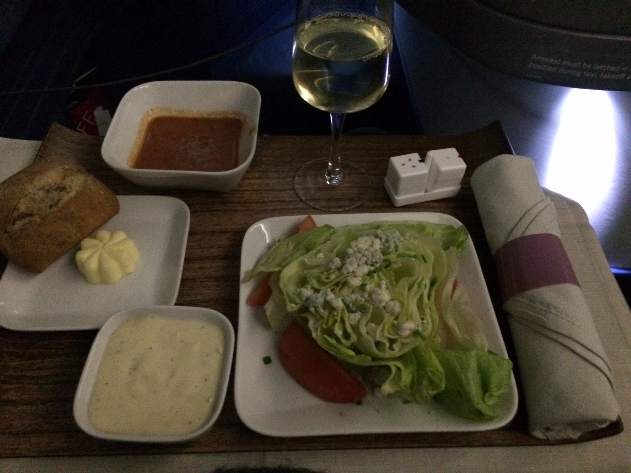 When dinner was finally cleared away, I laid the seat flat (and by flat I mean at a pretty steep angle. They were angle flat beds not lay flat beds, a difference I can fully appreciate now!)