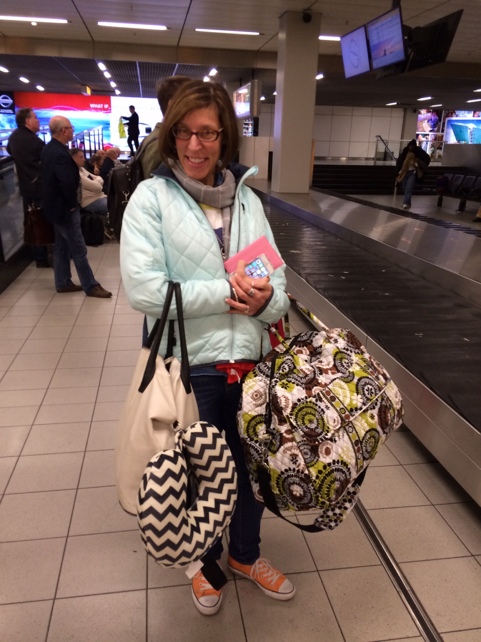 I knew Jenni and Pearl were going to land shortly after I did, but I wasn’t sure what terminal or gate they’d be in. I got swept up in the line to passport control and decided to try to find them in baggage claim. Although Jenni finally started traveling with a carry on, she’d talked Pearl into checking and bringing all her liquids.