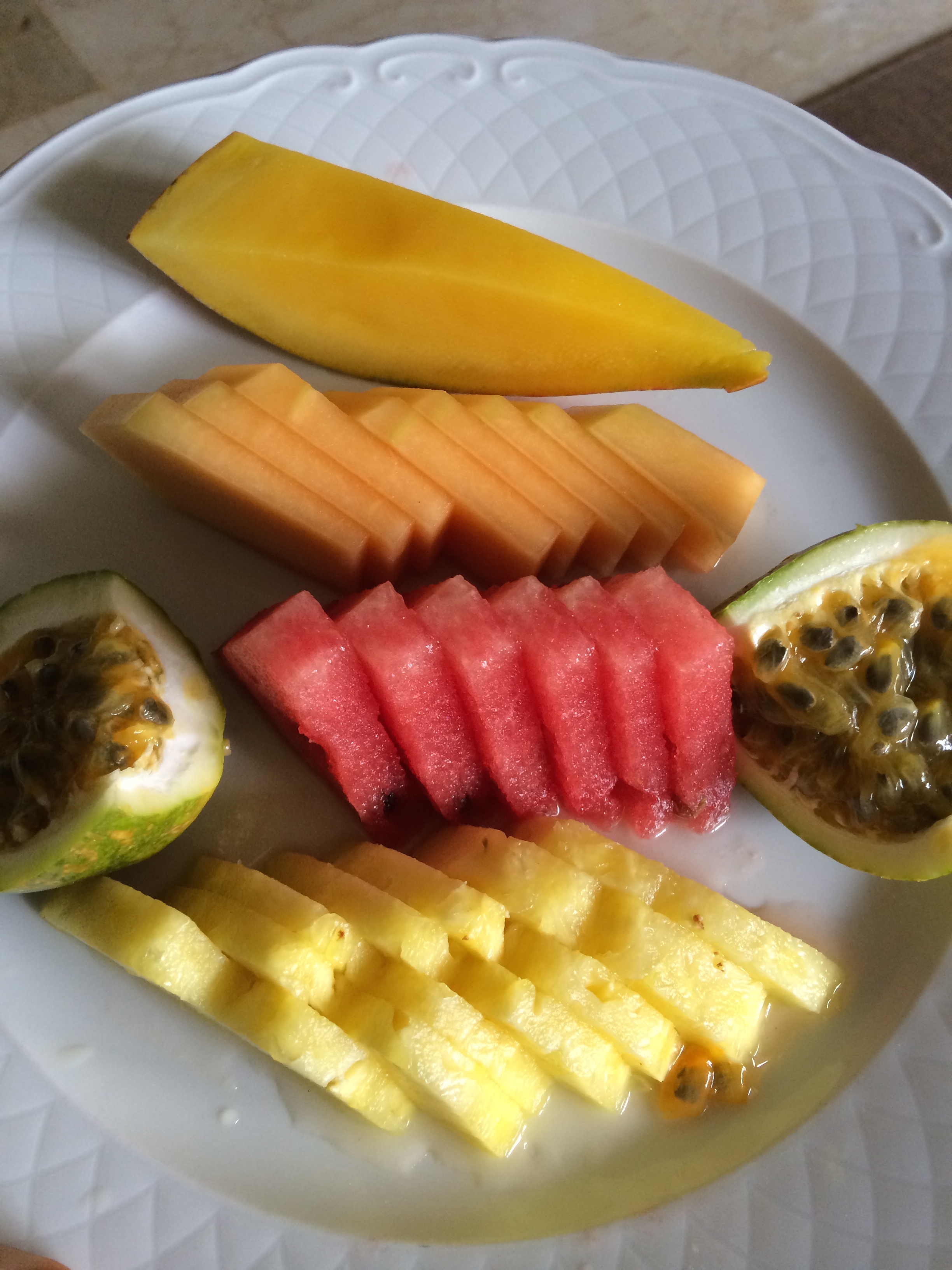 The Dominican included bacon, which I found too salty, a sausage, fried banana, ham and cheese omelette, a plate full of fresh tropical fruits, and a basket with assorted rolls and pastry. The omelette and the fresh fruit were the best parts, but I tried a bit of everything.