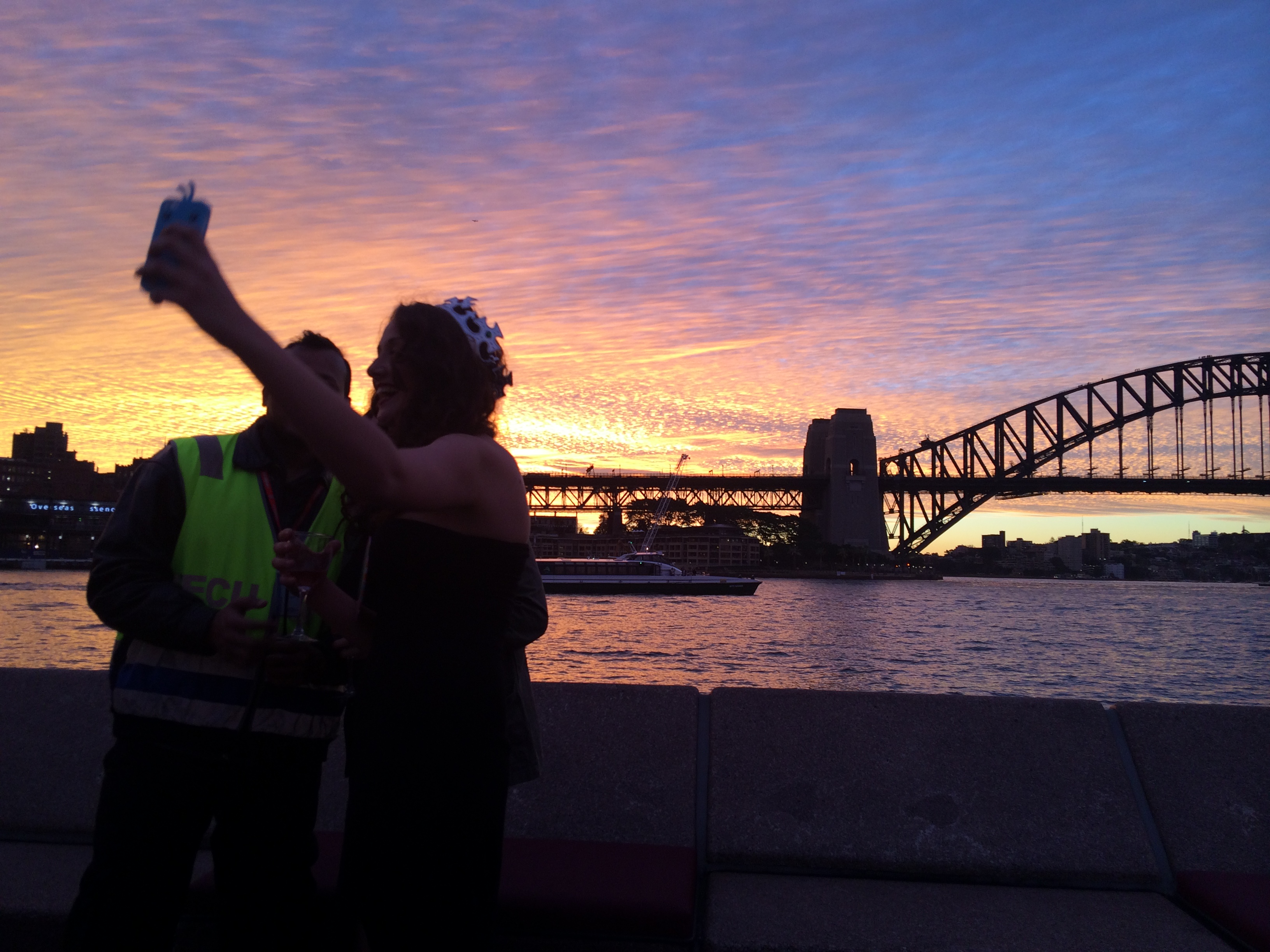 When she arrived, Jenni and I met her in our hotel lobby. She told us we had to move quickly in order to see the bridge in the proper light. We hustled up the street to catch a taxi and quickly flagged one down. We squeezed in the back seat. Our taxi driver was not impressed when Jenni put her feet on his center console and he told her to move her feet really angrily. I don’t think we were his favorite fare! We jumped out and hustled over to the opera bar just before sunset.