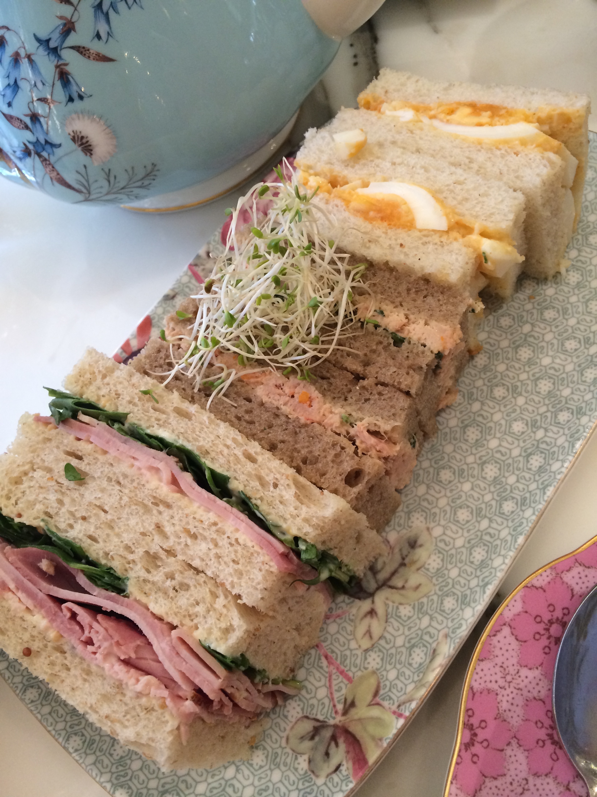 We emerged on a city street near a phone store so I popped in to inquire about jail breaking my phone (can’t do it) and T Mobile service (not in Australia). We gave up and continued our hunt for a tea shop. Finally, on the last level of the Queen Victoria Building, we found High Tea, a cute little tea shop tucked away in the upper corner. Cheryl and I split a tray of finger sandwiches (yummy) and I had a pot of earl gray tea.