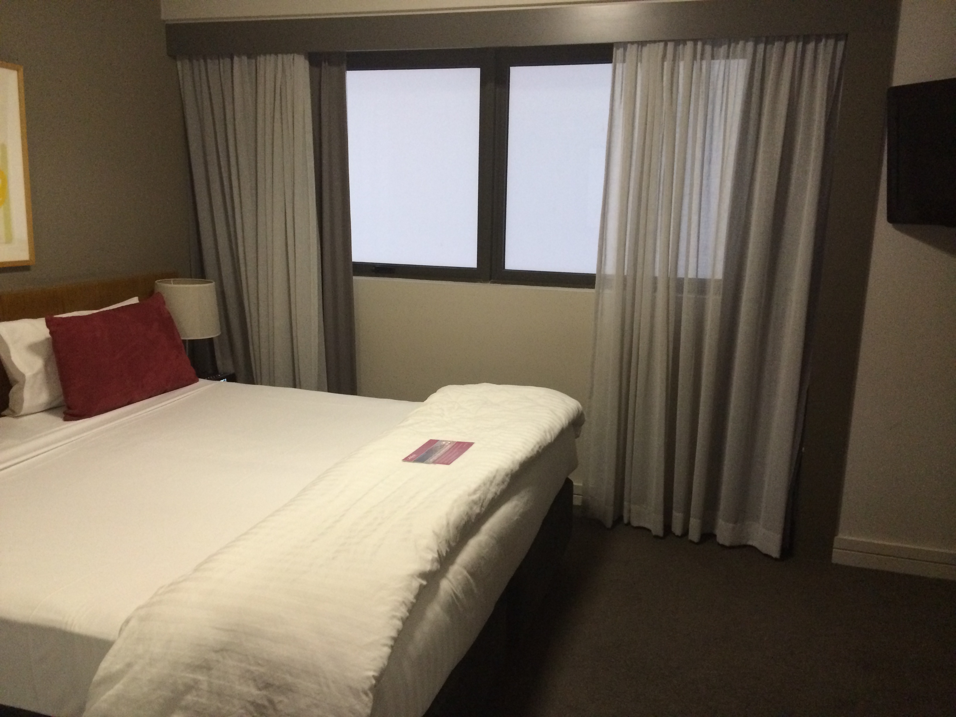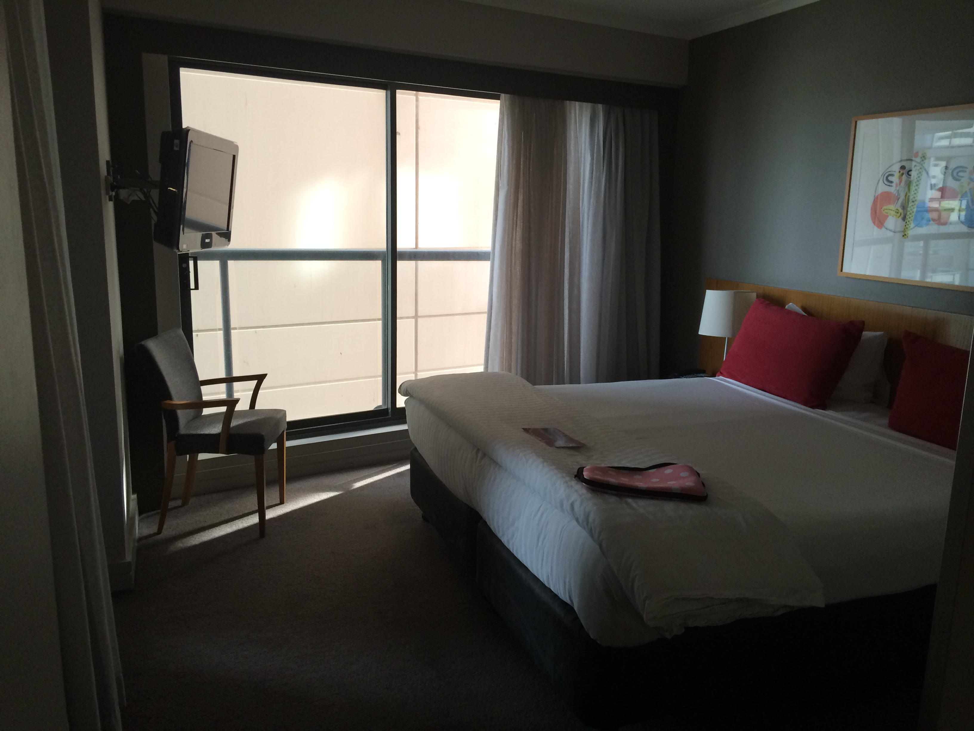 Jenni and I got into our room. They reserved a two bedroom apartment for us. Jenni went into one room, spotted the TV mounted on the wall, and declared that room hers. I was in the other bedroom, standing next to one of the two doors to the balcony, staring at the tv mounted on my wall and said, OK.