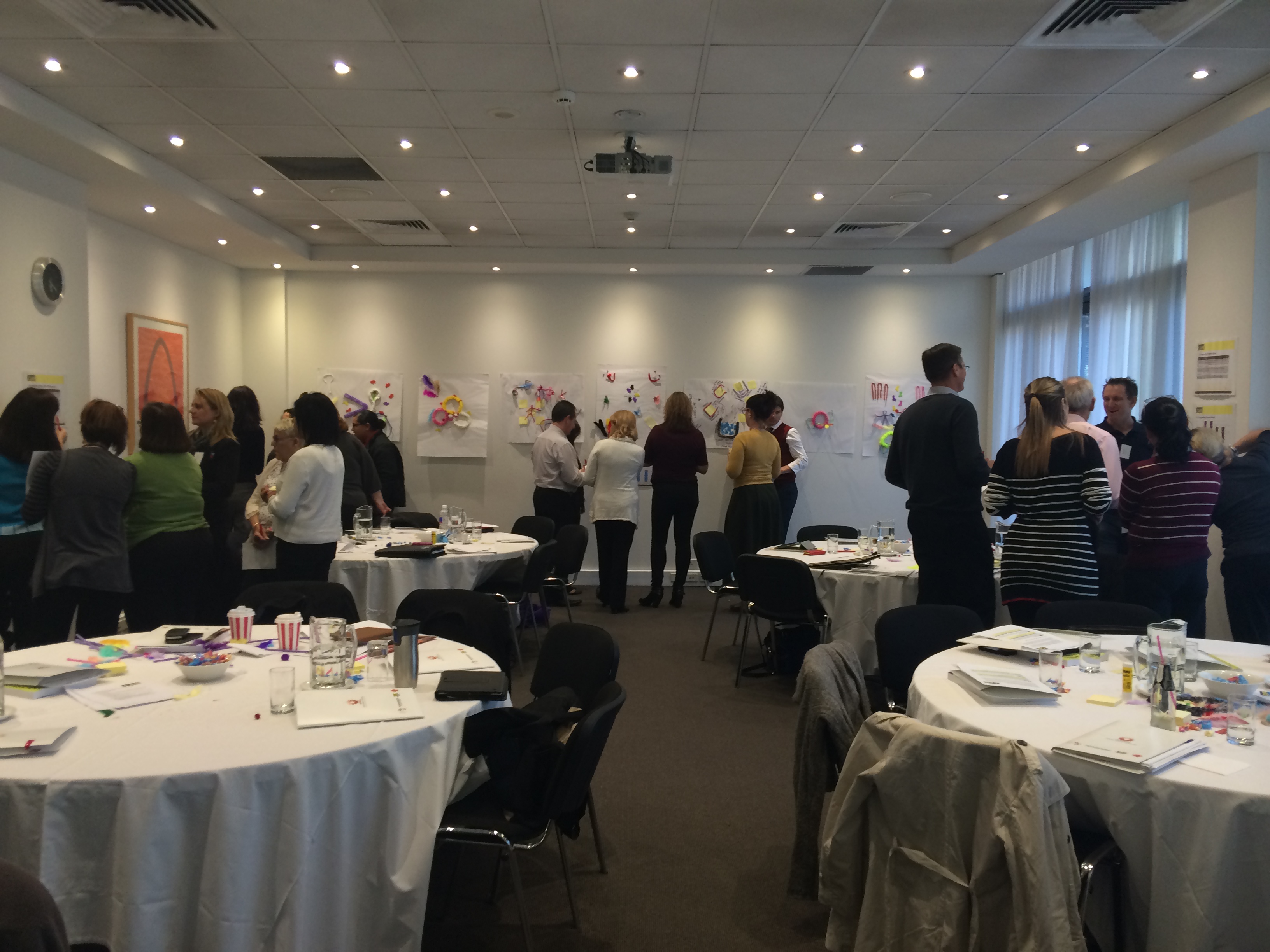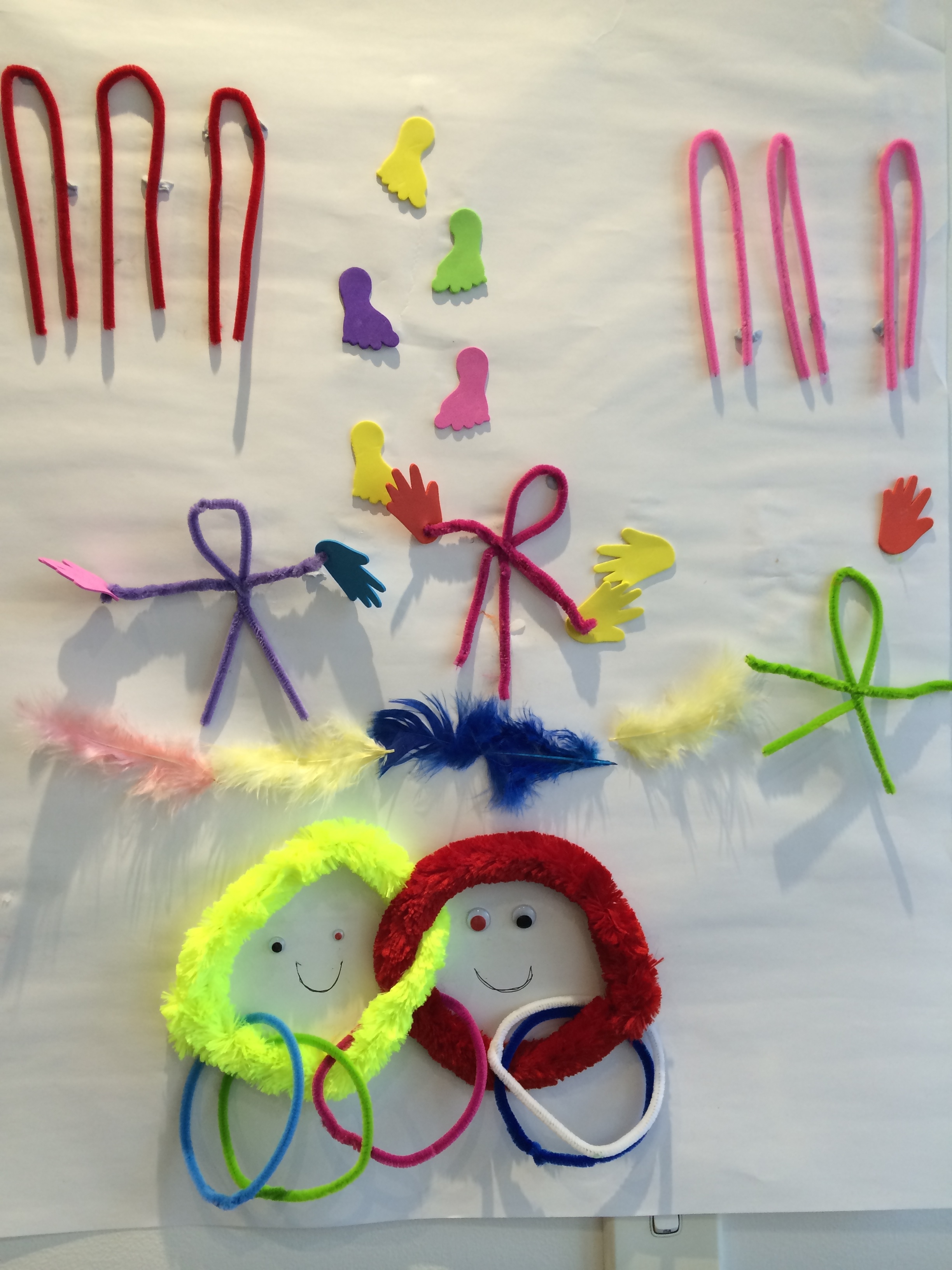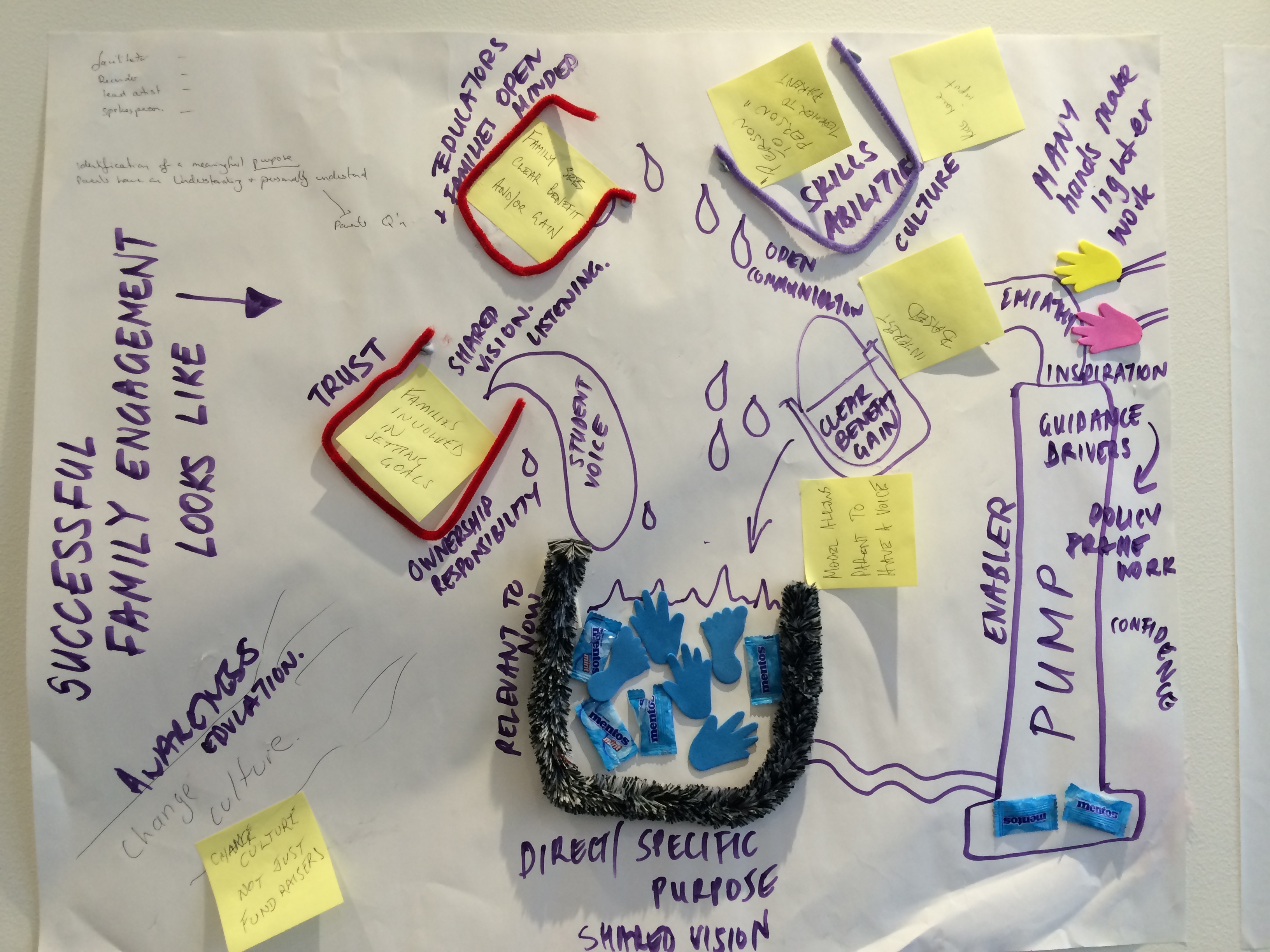 We kicked off our training with a mixed media art activity and asked each table to construct a poster that illustrated their vision of what successful family engagement would look like. They had feathers, pipe cleaners, pom poms, foam hands and feet, googly eyes, and glitter.