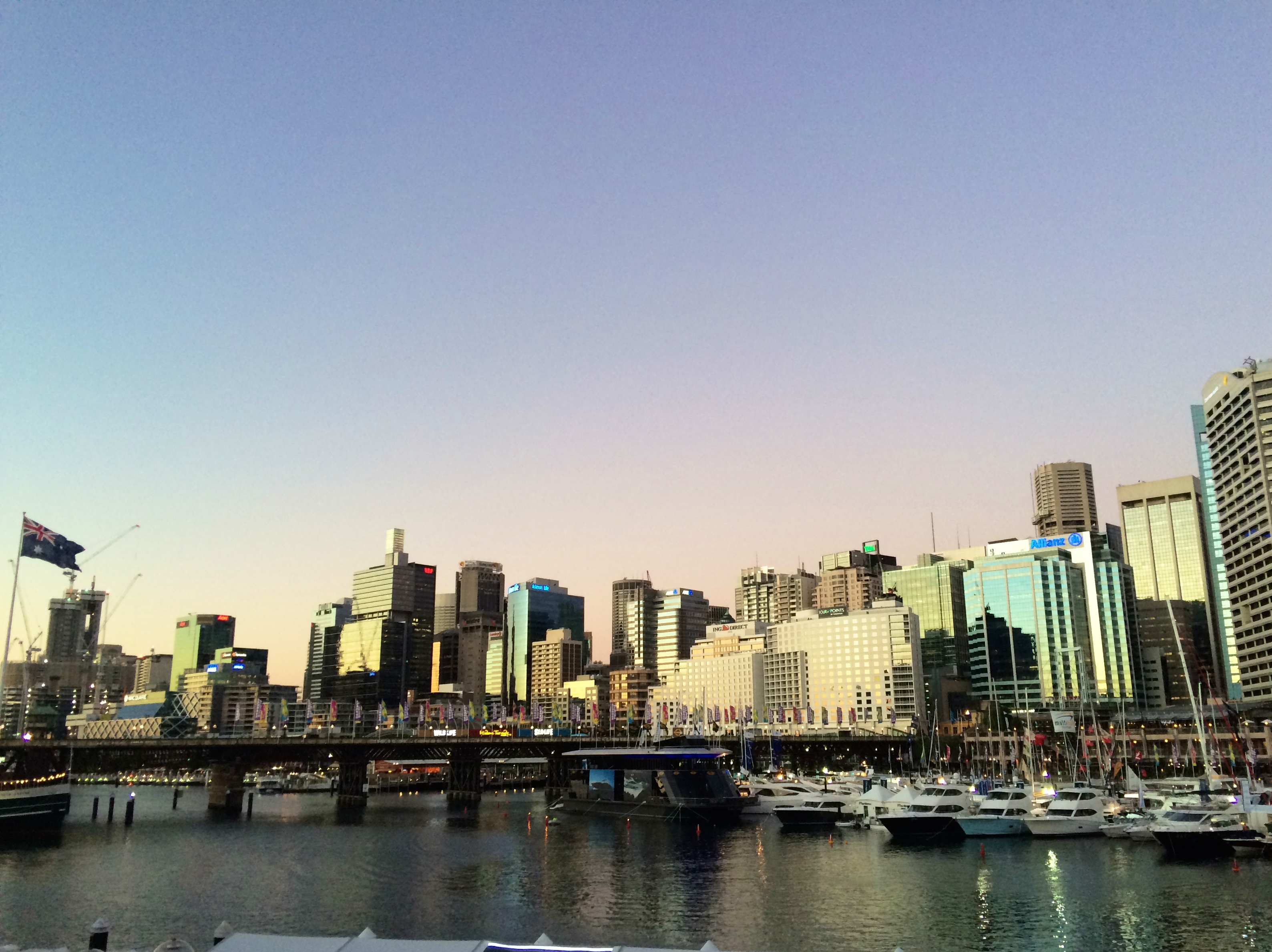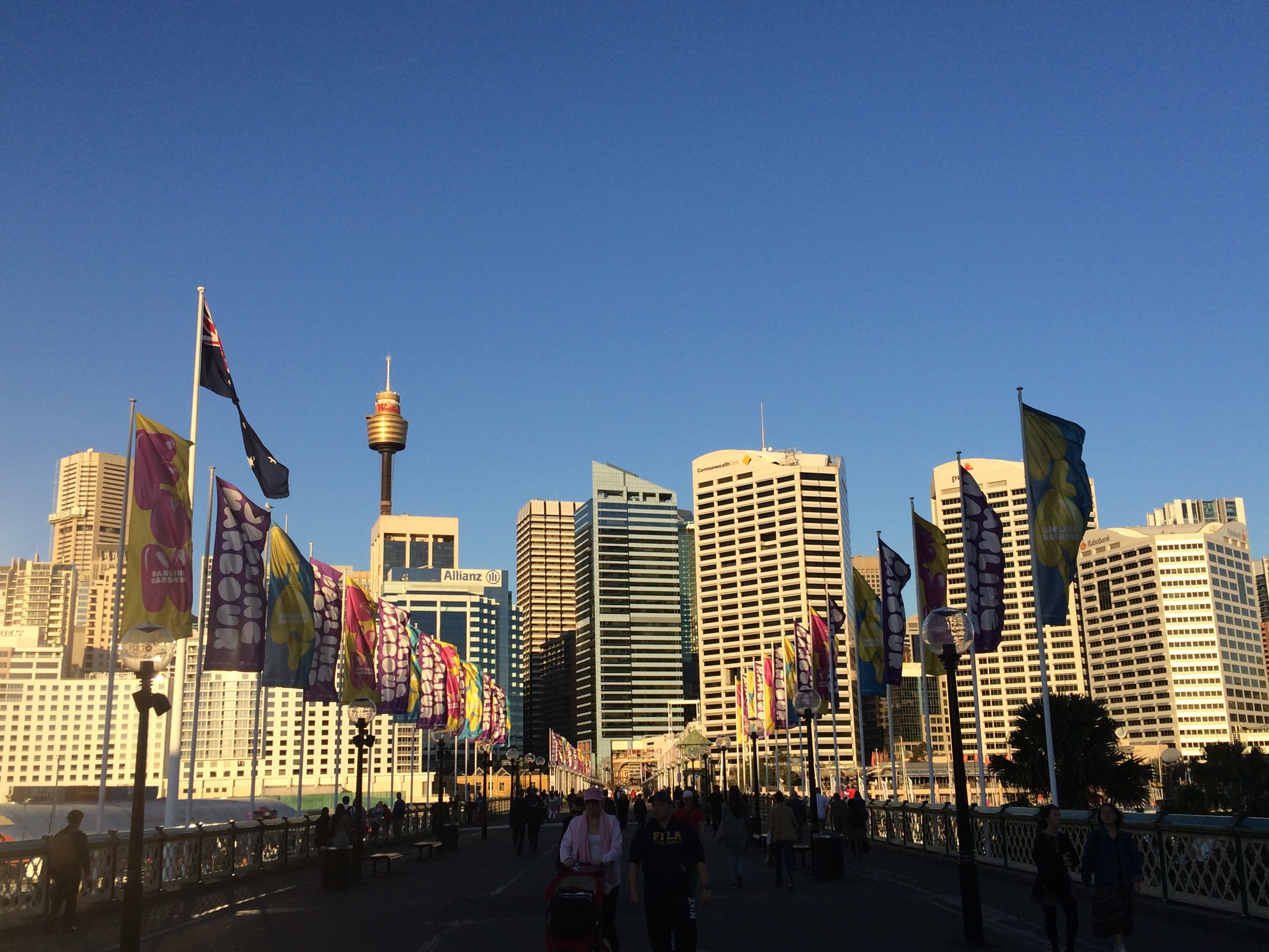 We decided the best place to take the call would be in Darling Harbor, near the shops! Also, we’d exceeded the data count on our portable hotspot and hoped to find some free wifi so I could get online as well! We walked across the bridge to the shops and the views were stunning!