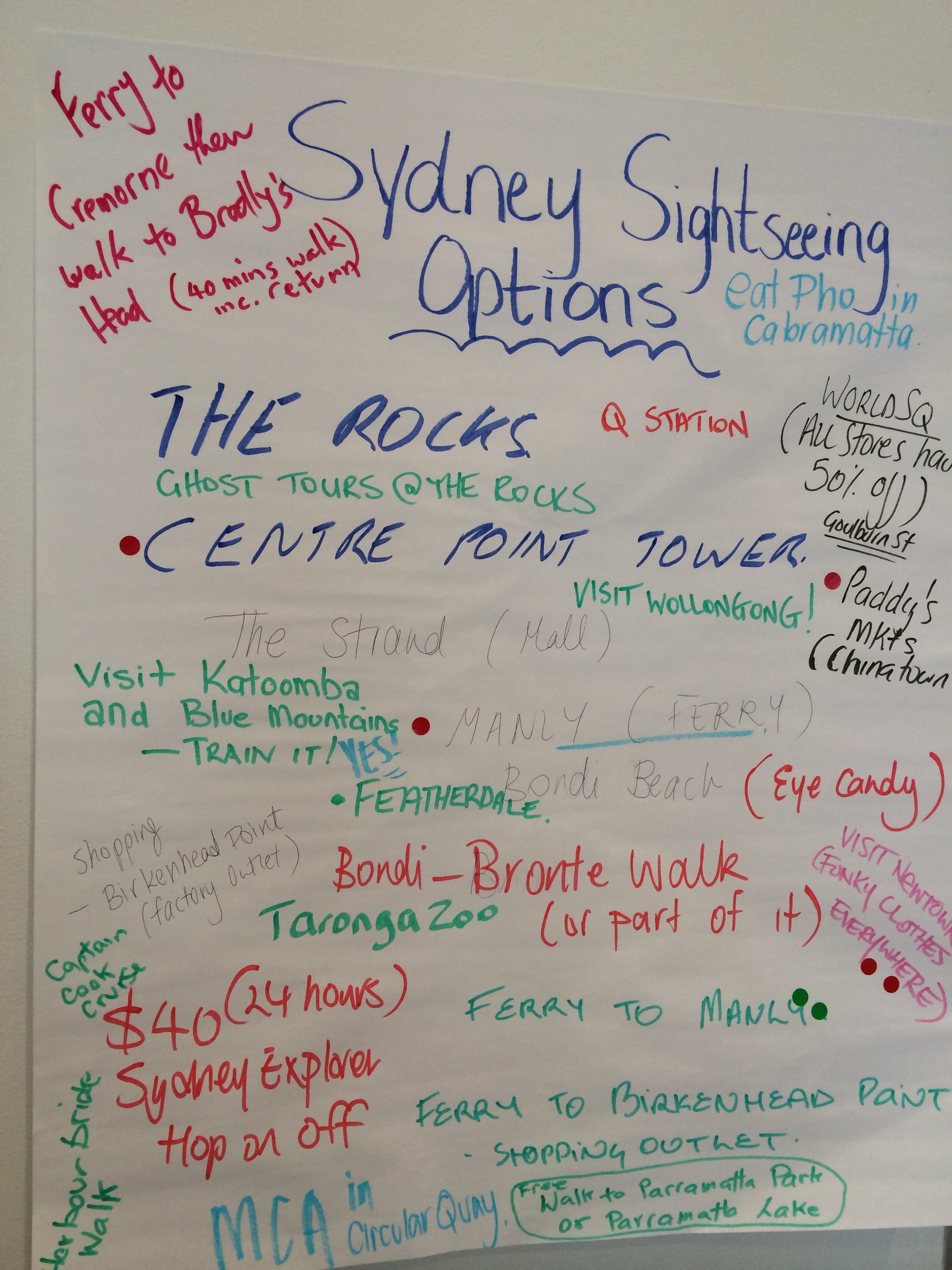 Day two of our Sydney training started earlier. We hustled over to the training venue and set up all of our materials. My friend Jeanette, who just happened to be one of our participants, helped us out and recorded participant responses.