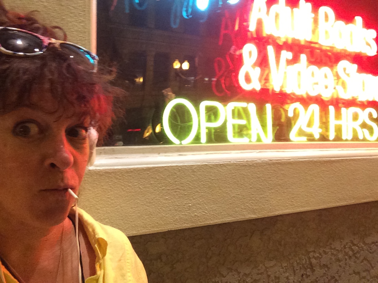 through the subway, into an adult book store…