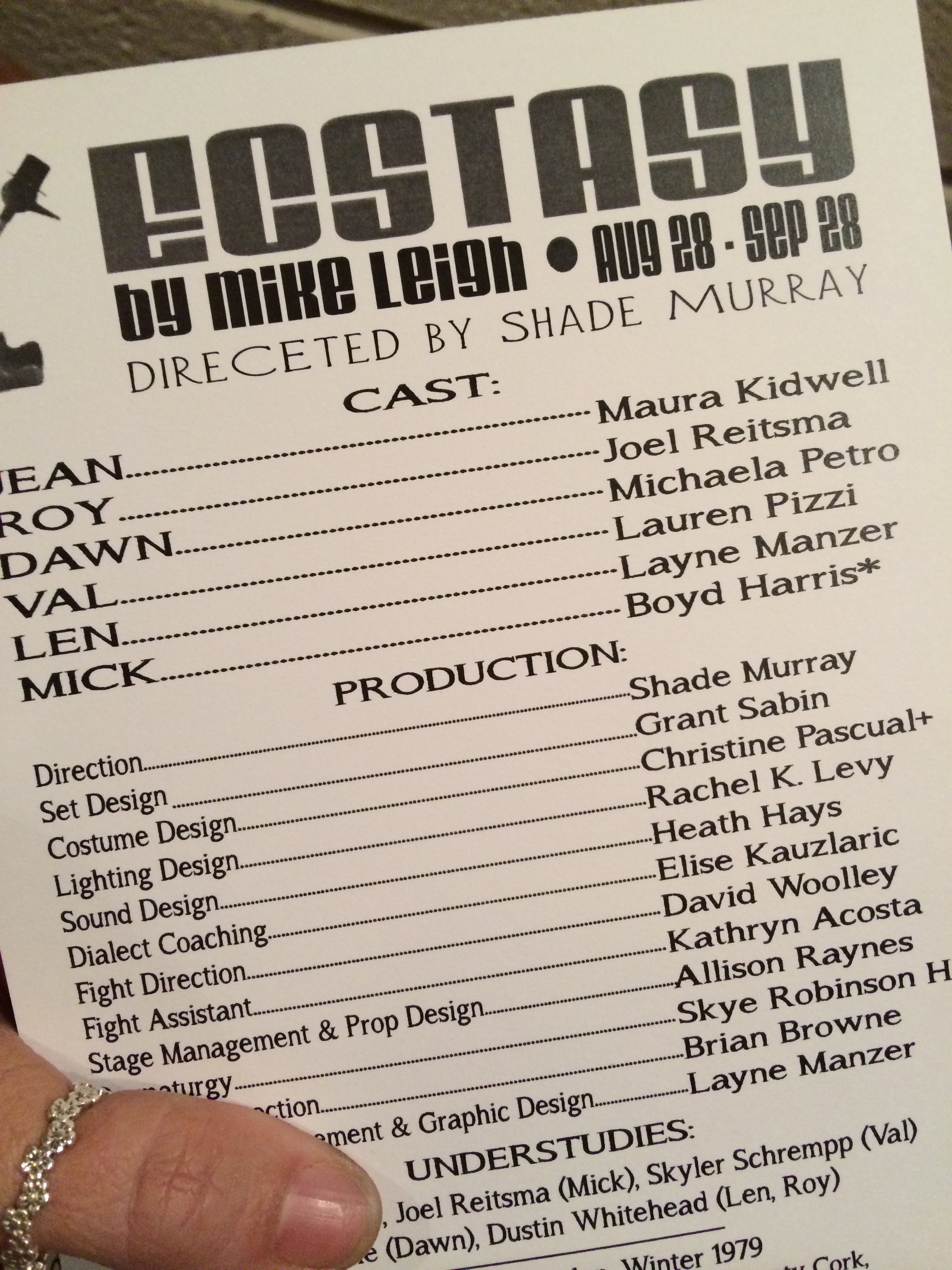 The next show was Ecstasy, which did have full frontal nudity, but even that wasn’t enough to impress me. The first act was weak and I was totally distracted by their constant attempts to fake light up their electric cigarettes. It was the UK in the 70s, they smoked, I get it. But, my God, it seemed like they lit a new cigarette every time they had a line. Also, the fake British accents were terribly distracting. Bob and Angel liked it, I was less impressed.