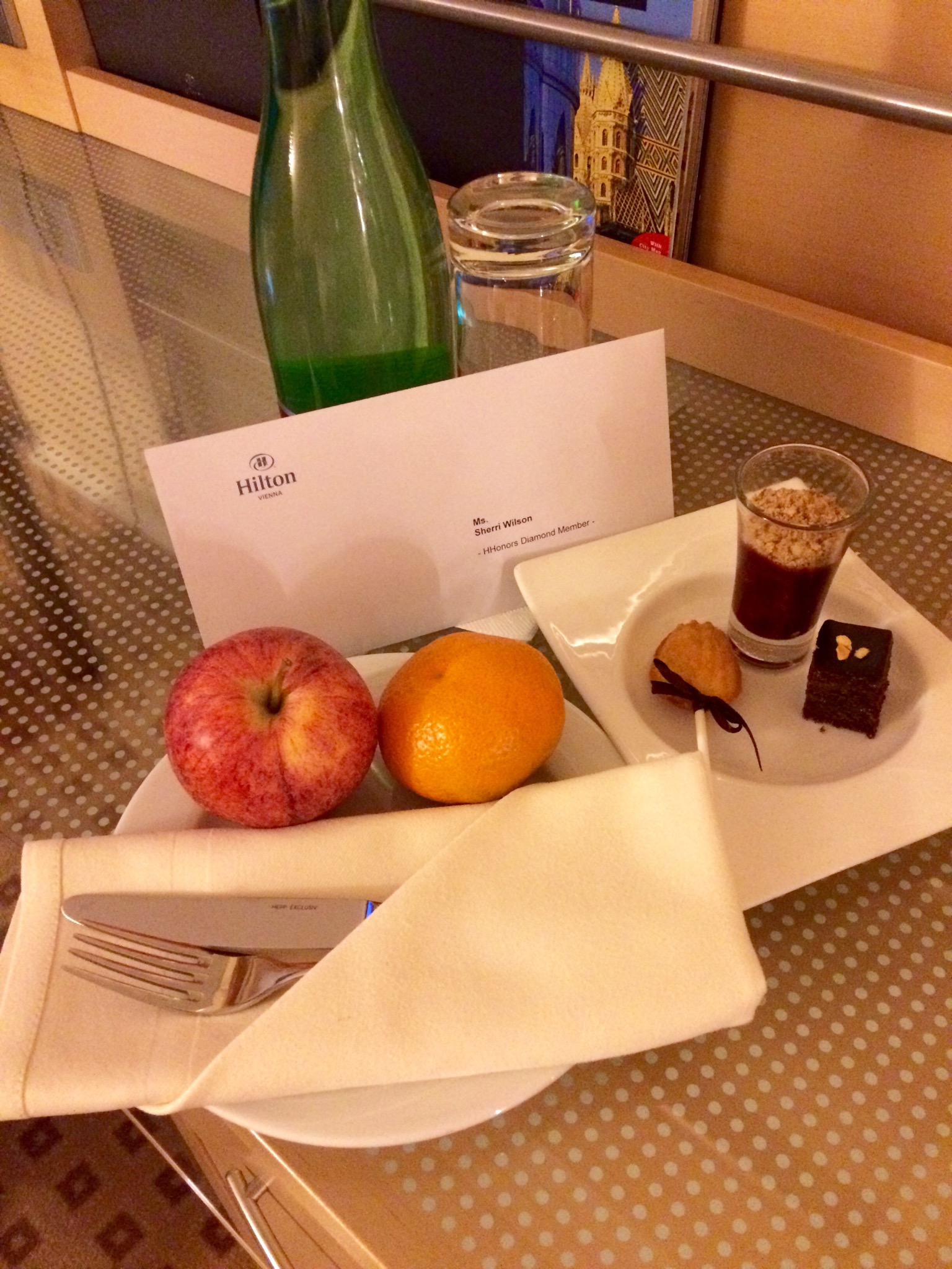 There were a lot of other treasures, though I was slightly more impressed with the Crown Jewels in the Tower of London. Afterwards we took the metro back to the Hilton Plaza hotel and picked up our bags to move them to the Hilton Vienna, a larger hotel that was across the street from the City Airport Train terminal. The treats in my room were delicious, but I was sad they didn’t leave me a bottle of wine like the last Hilton!
