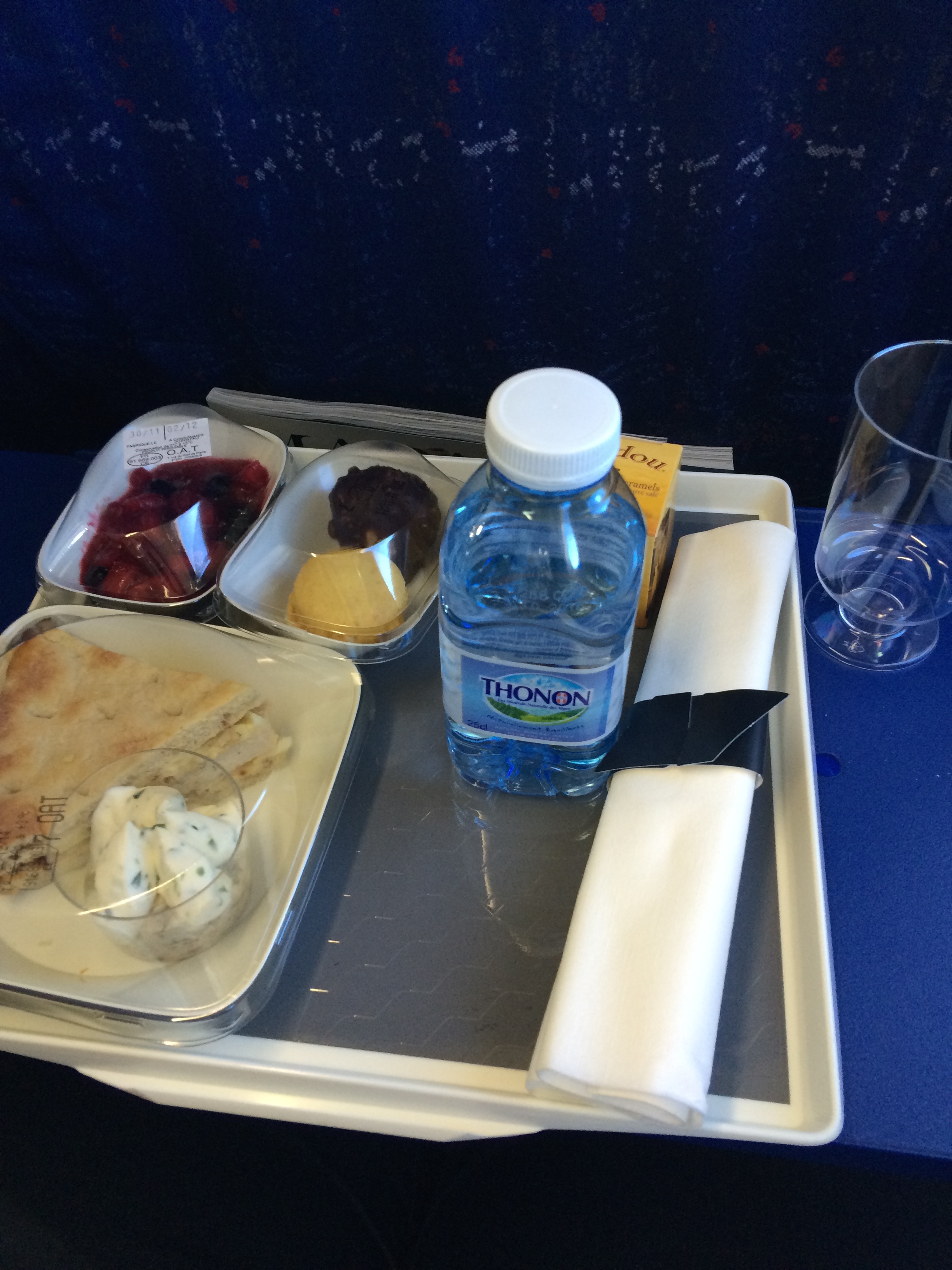 We boarded the flight to Paris pretty quickly. I was sitting next to some hot young British guys. We were in Premium Economy, which I believe I’ve already mentioned the French take very seriously! They brought a lovely breakfast that included a fresh macaroon and a glass of champagne.
