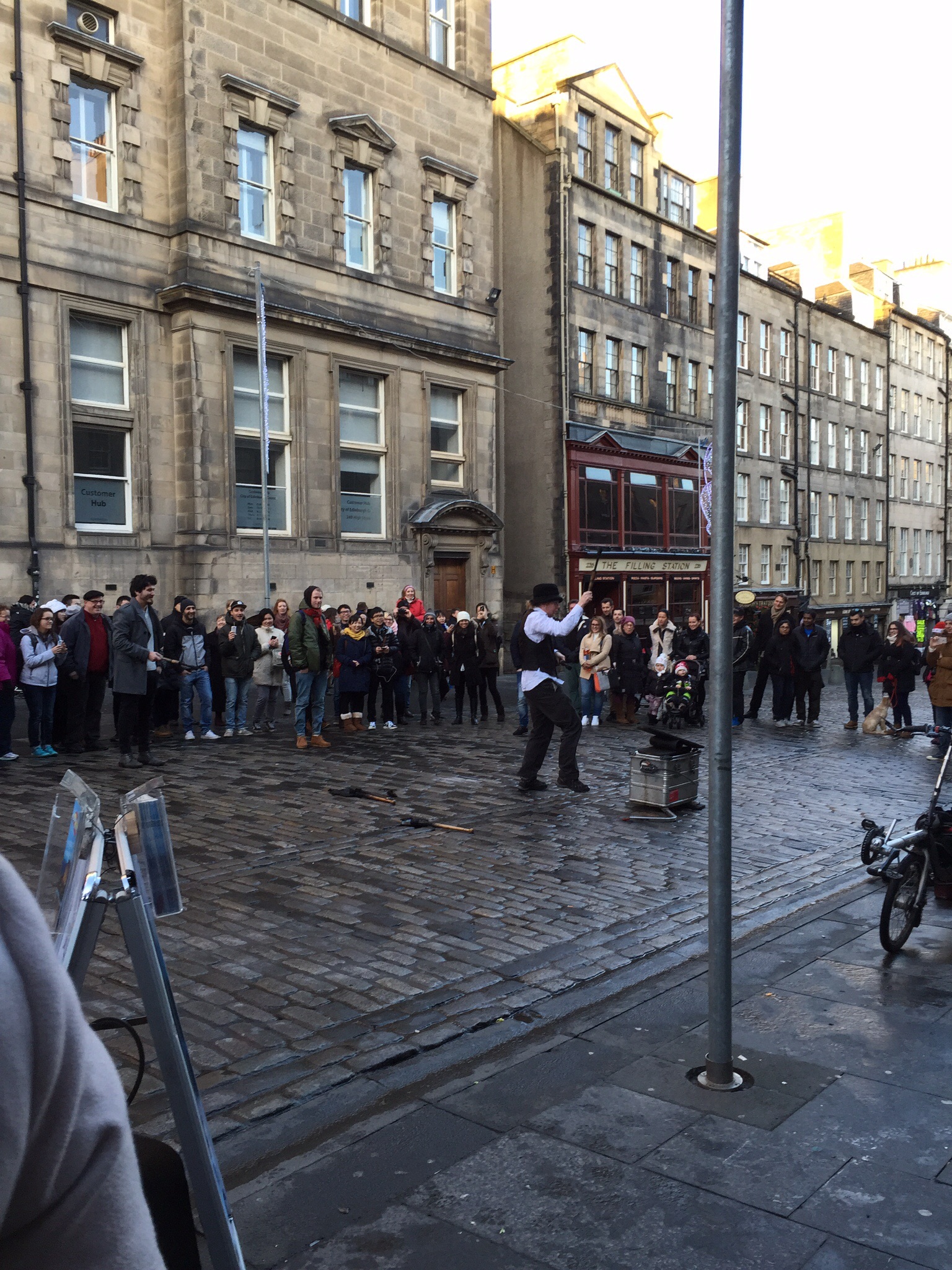 After lunch, Amanda suggested a walk to Coltan Hill. It’s a hill that overlooks much of the city and has several Scottish monuments. To get there we strolled down the Royal Mile. Along the way we saw a street performer…
