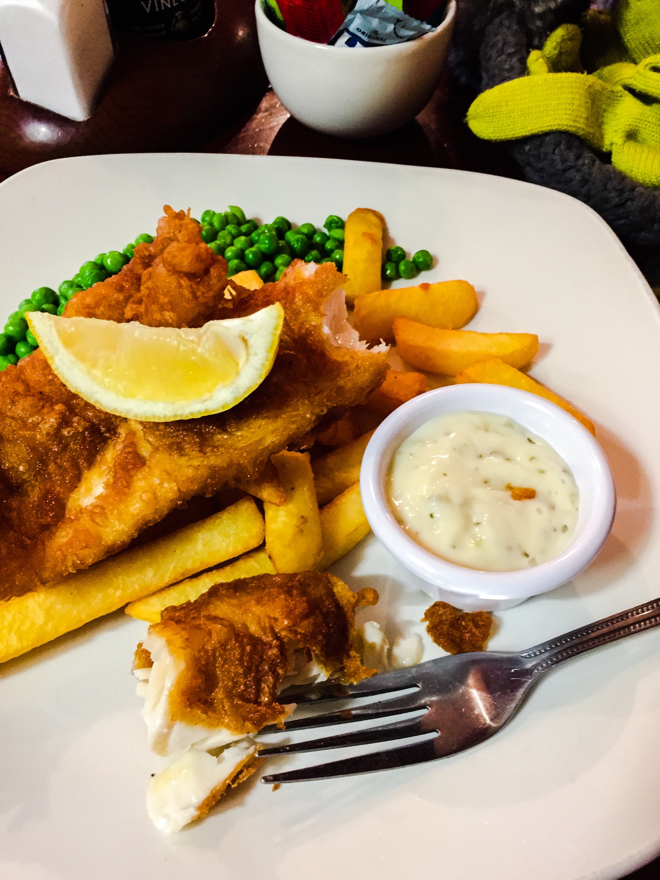 When I got back to the center of town I saw a sign that said “Fish and Chip Award Winner from Fish and Chip Awards” on No. 2 Baker Street, a little pub on the corner. Since I hadn’t had lunch yet and was cold and hungry after my near brush with death on the cemetery path, I decided to try it!