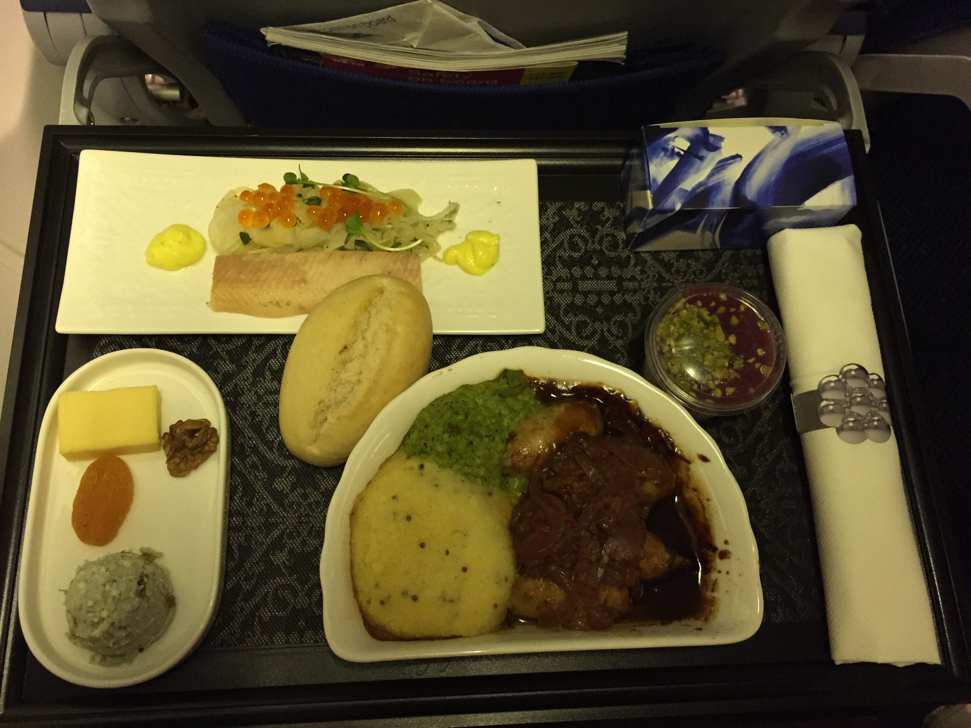 After take off, she came right back to find out if I would prefer the ravioli or the veal sausage and what kind of drink I’d like to start with. I opted for the Perrier because it’s important to stay hydrated. Also, I chose the veal. I’m not sure if the ravioli was any good but the veal was delicious!