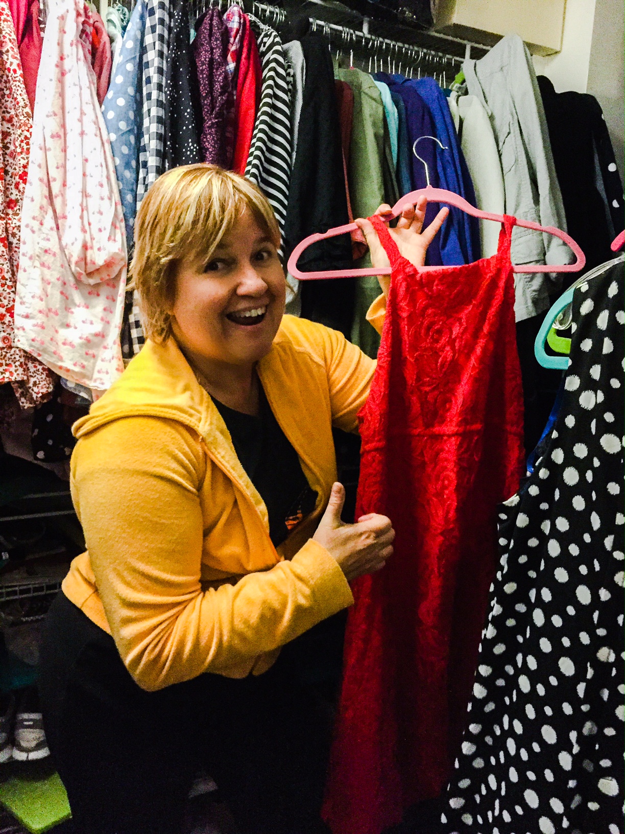 Alicyn said the camera loved me in red, and quickly moved to the red section in my closet. That’s right it is organized by color, shape and style.