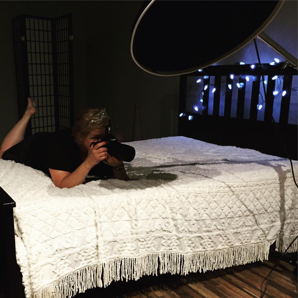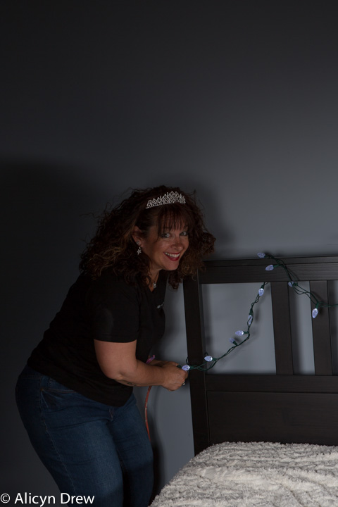 Everything looked great and Brandy came out. She looked amazing! I’d show you the pictures but I wouldn’t want to ruin the surprise for Corey. Take it from me he’s a very lucky man! Jackie plumped up a few of the important bits (boobs) and stepped in to adjust various straps and hair. Ali began shooting and I DJed the entire event. I’d tried to pick songs that would put everyone “in the mood” and pay homage to Brandy’s love of 80s music. After the first few poses, Ali decided to add some extra lights to the headboard.