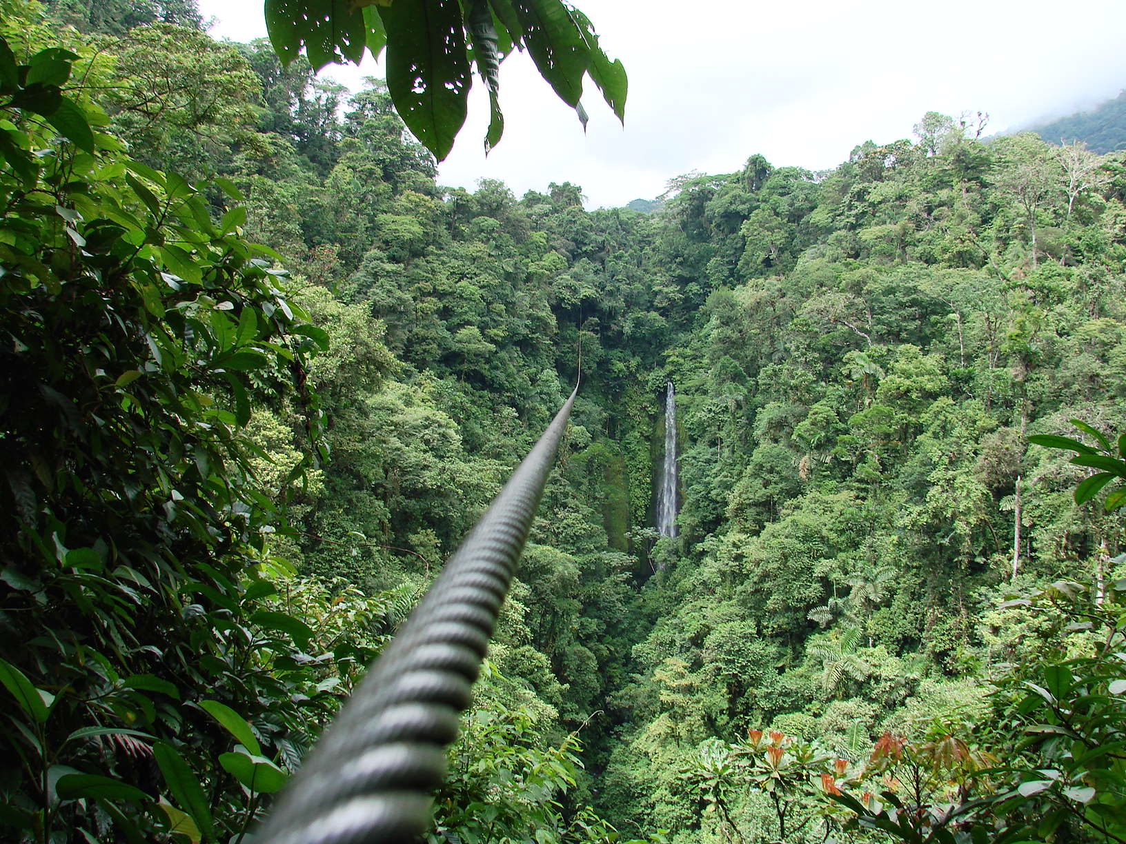 When we finally took off again, I’d clearly forgotten something. Halfway along the line, my body started rotating. As the treetops were whacking my shins, I panicked and took my brake hand off the line. When I realized what I was doing I tried to put it back on, but I smacked the top of my fingers on the line before I got it right. I still made it across without stopping, but it was a painful lesson! And once I arrived at that platform, I had to wait a couple of minutes for my turn on the next one. The wait was intensified by my sore knuckles and the sight of some of the college kids zipping by the La Fortuna waterfall just beside us. That zip line was 120 meters up and half a mile long!