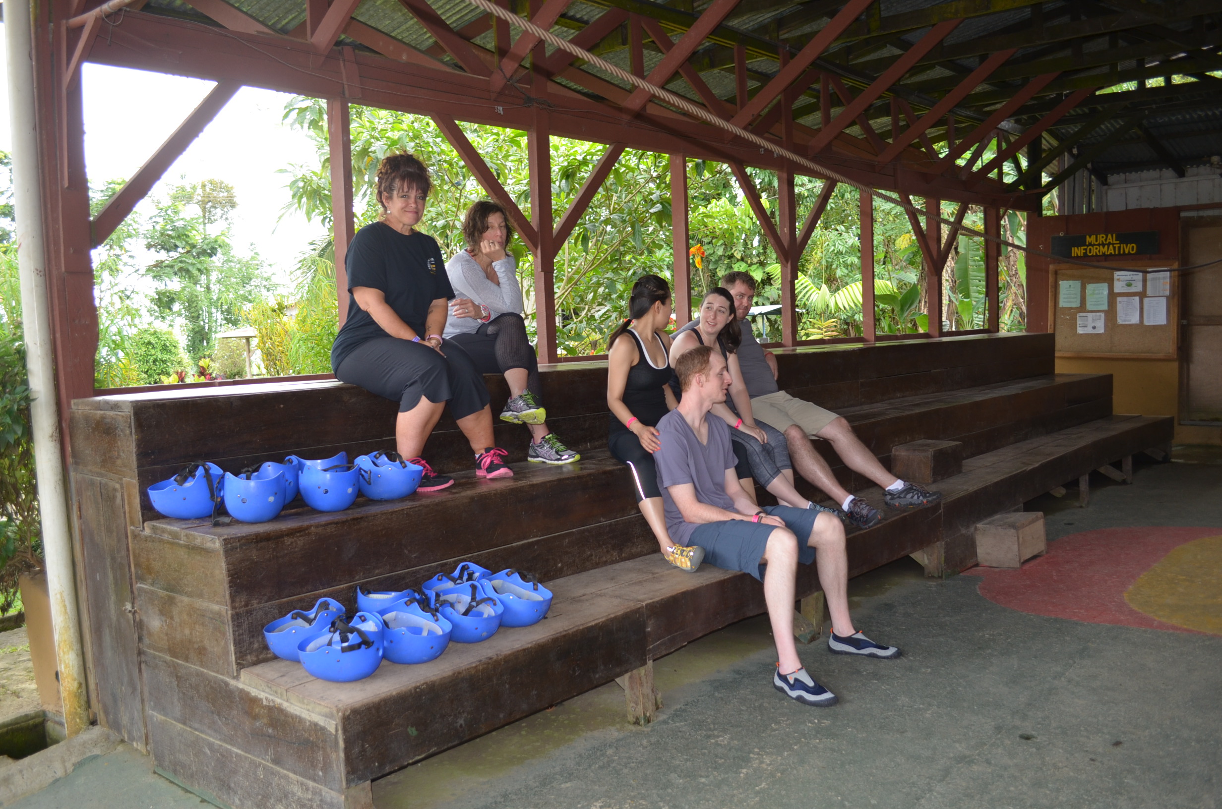 I’d booked a package deal from Arenal Mondo Aventura and the van to take us there arrived a little after 9:30. There were two other couples staying at our resort who were also taking the tour. As soon as we arrived, they gave us a brief demonstration. And when I say brief, I mean it was very quick but long enough for Jenni to whisper to me, “in Hawaii, there were built in brakes. We didn’t have to do that ourselves.” They showed us the hand signal for brake, don’t brake, pick up your knees, go faster or you aren’t going to make it and OMG STOP MORE! They said there would be a guide on the landing platform and we shouldn’t do anything unless we see them giving us a signal. They also told us if we stopped before the end we would need to turn backwards and pull ourselves hand over hand to the other side.