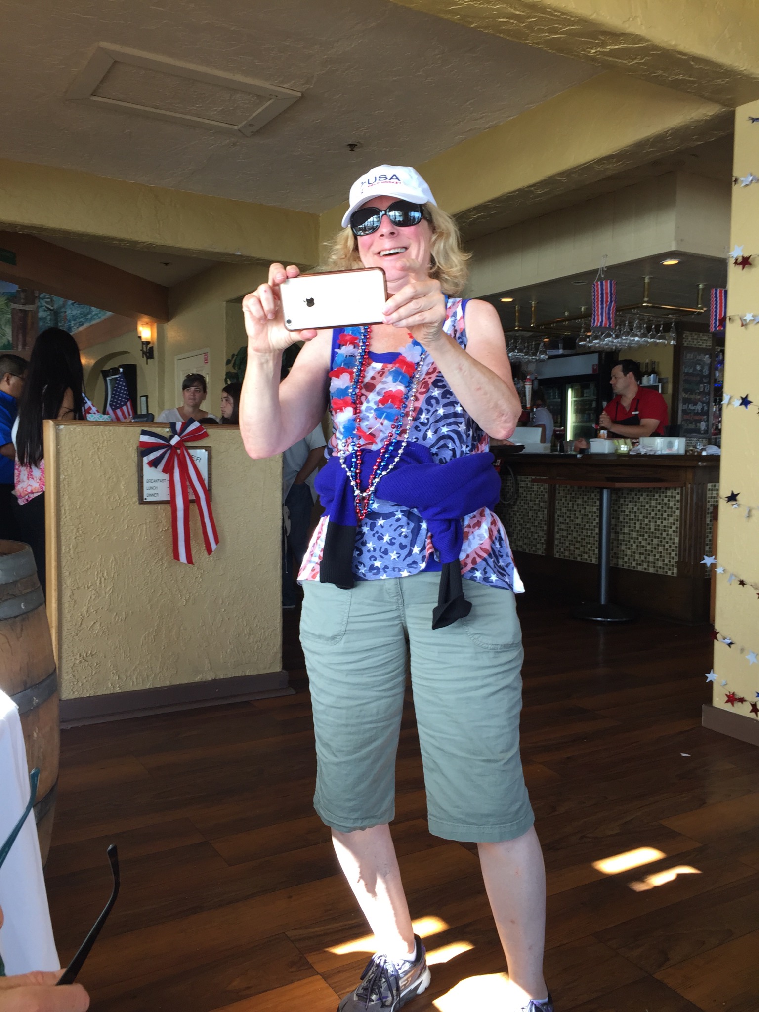 It’s important to stay hydrated and Lisa knew which restaurant made pineapple infused vodka so we put our name on the wait list at the Edgewater Grill for a table outside. We took a few selfies while we were waiting until a super helpful patriot wandered over and insisted on taking it for us.