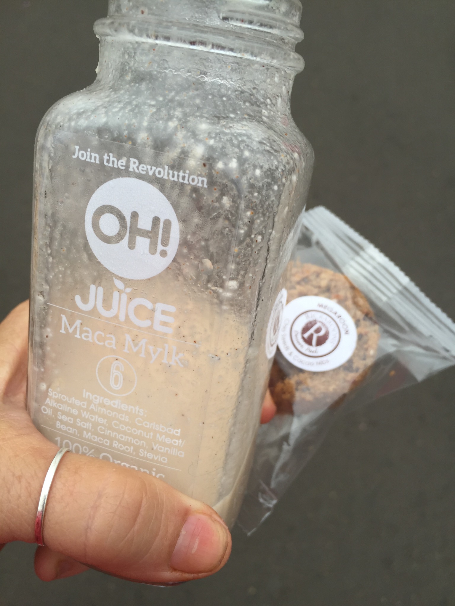 We strolled through the market and browsed among the stalls of organic veggies and fresh flowers. There were lots of samples, and after sampling a variety of Oh! Juice, we decided to have a liquid breakfast! I had the Maca Mylk and Lisa got the Strawberry Maca Mylk. (which I’d have chosen had I known about chia seeds!) We continued on and then found some actually tasty, gluten free, vegan coconut treats. I have no idea what they were but it really made my breakfast complete.