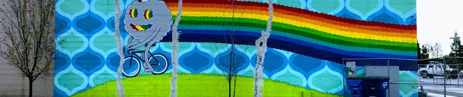 I found a fantastic and whimsical piece of street art (Bicycling by Jon Stommel) tucked away behind my hotel. Next to it was the bridge I could see from my hotel room (I couldn’t find the artist) and the wall of murals which turned out to be the Remembrance Wall for veterans.