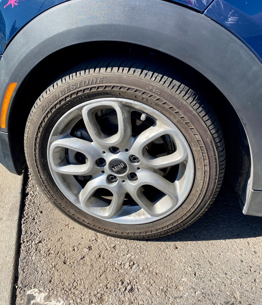 They told me the MINI tire size is unusual and they don’t carry it in stock. It would be a couple of days for them to order one in, but they just happened to have a used MINI tire in their back room and would sell it to me for $35 He started to tell me about the tire but I was shouting, “I’ll take it!” so he didn’t get very far!