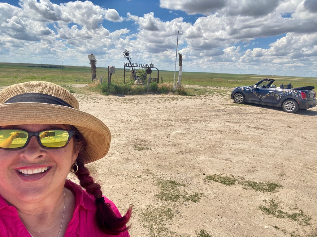 As I was making my way back to the interstate, I noticed a sign for the Sky and Land Scenic Byway. I pulled into a parking lot and discovered that along the route was Mt Sunflower, the highest point in Kansas. I decided that was well worth the trip because it would give me a sort of practice mountain before I got to Pike’s Peak. I took the byway from Goodland to Sharon Springs. I found the road to Mt Sunflower and was really surprised it wasn’t paved but I thought maybe it would be paved when I got closer to the actual mountain. That was wrong. It was never paved and it isn’t an actual mountain! It’s a 12 mile driveway that is apparently part of a working cattle ranch with a few pieces of metal art!