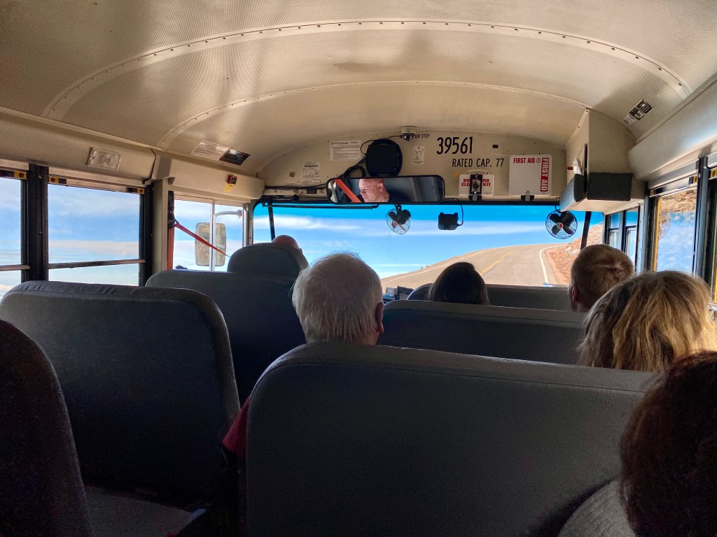 When I parked at the top, I was directed over to a parking area and then walked to the bus line. The busses were large school busses. The last time I rode in a school bus was when I was ziplining in Costa Rica and the bus ride was fun but riding an old, battered bus up the side of the mountain was as terrifying as the zip lines. Maybe I have an aversion to school busses?