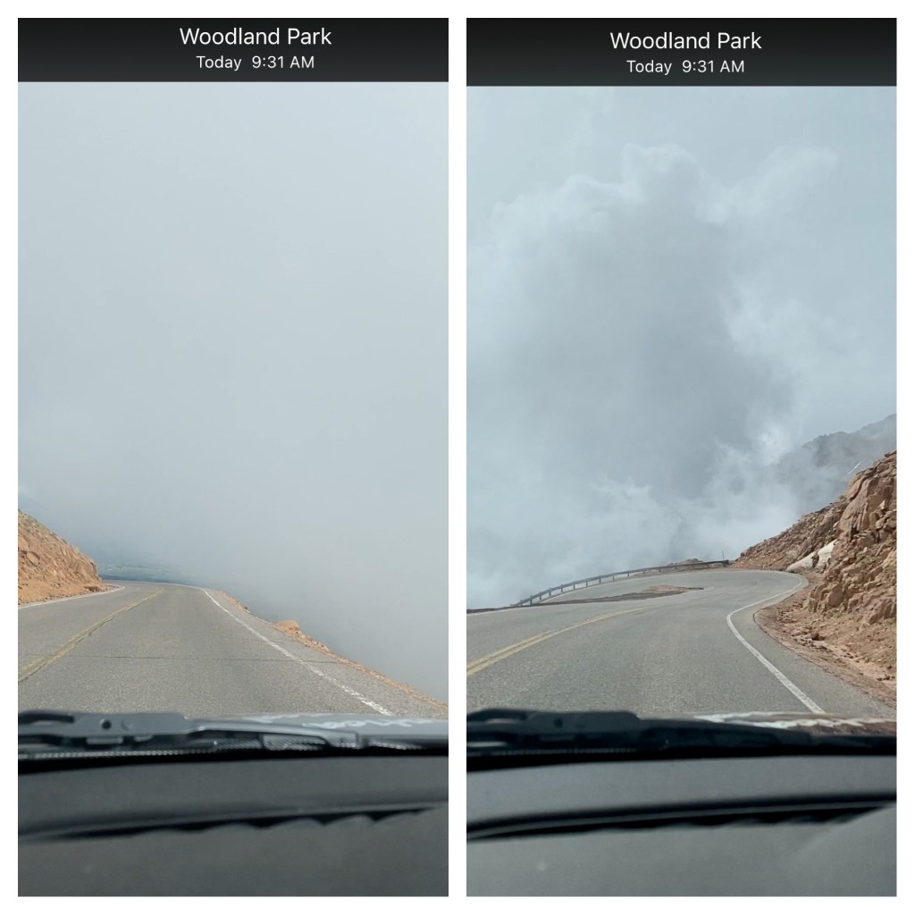 Stills grabbed from my fuzzy dashboard video. The sudden cloud cover prevented any of you from seeing the sheer drop offs at the edge of the road. Also hard to appreciate that it was a VERY steep grade.
